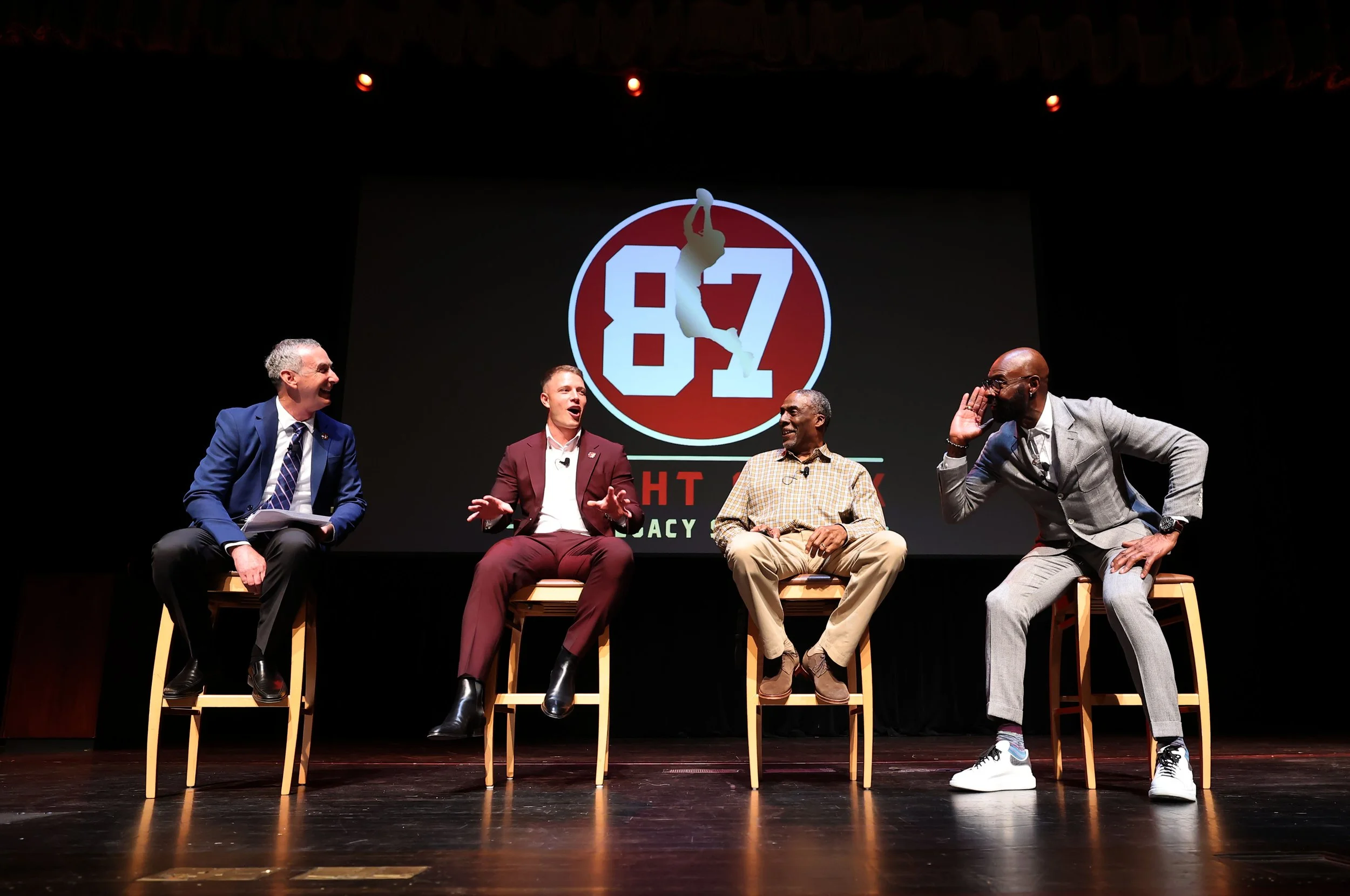 Matt Maiocco, Christian McCaffrey, John Taylor and Jerry Rice laugh on stage during the 2023 Dwight Clark Legacy Series event. Photograph by Terrell Lloyd
